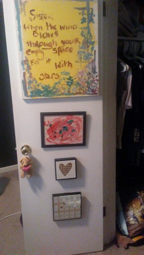Eventually, I decided to create appreciation. We bought paint, and started with our bedroom. We got lovely curtains at a flea market. I decorated my closet door with things that were inspiring to me–gifts and words of encouragement. When I would open that small closet in the morning, I would see things from people I loved–a great way to start the day.